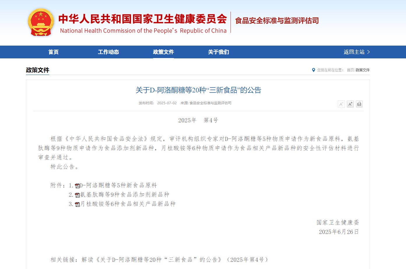 2025年3月,国家卫生健康委员会正式启动D-阿洛酮糖作为新食品原料的行政许可征求意见程序,并于近期完成审批。这一政策突破具有三重里程碑意义:填补我国低热量甜味剂领域空白;为食品饮料企业提供更丰富的健康配方选择;标志着我国在功能性甜味剂领域的技术标准与国际接轨。