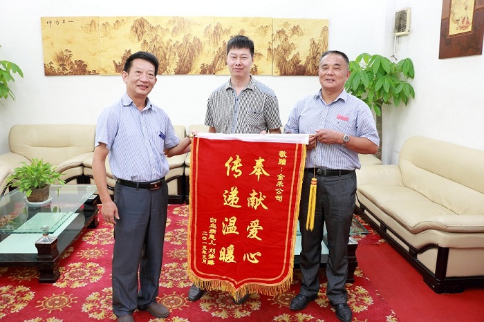 2015年9月18日上午,白血病小患者梦蝶的父亲专程来到金禾实业公司,敬赠一面“传递温暖 奉献爱心”锦旗,表达一份感恩的心。刘梦蝶是舜山镇耿郢村八岁小女孩,去年11月份不幸患上急性淋巴细胞白血病,一家人陷入恐慌无助之时,公司在第一时间登门看望,了解情况,疏导鼓励,伸出援手,主动捐助。经过近一年的治疗,小梦蝶恢复的很好,现正在康复中,不久就要出院回家。今天,小梦蝶的父亲到金禾公司是来表达一份真挚的感恩心愿。