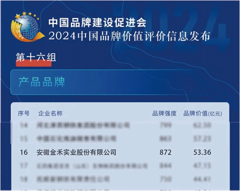 在此次发布的“2024中国品牌价值”榜单中,安徽省仅有6家企业上榜,金禾实业凭借稳健的运营和持续的品牌建设入选产品品牌价值类榜单,品牌强度872,品牌价值53.36亿元。