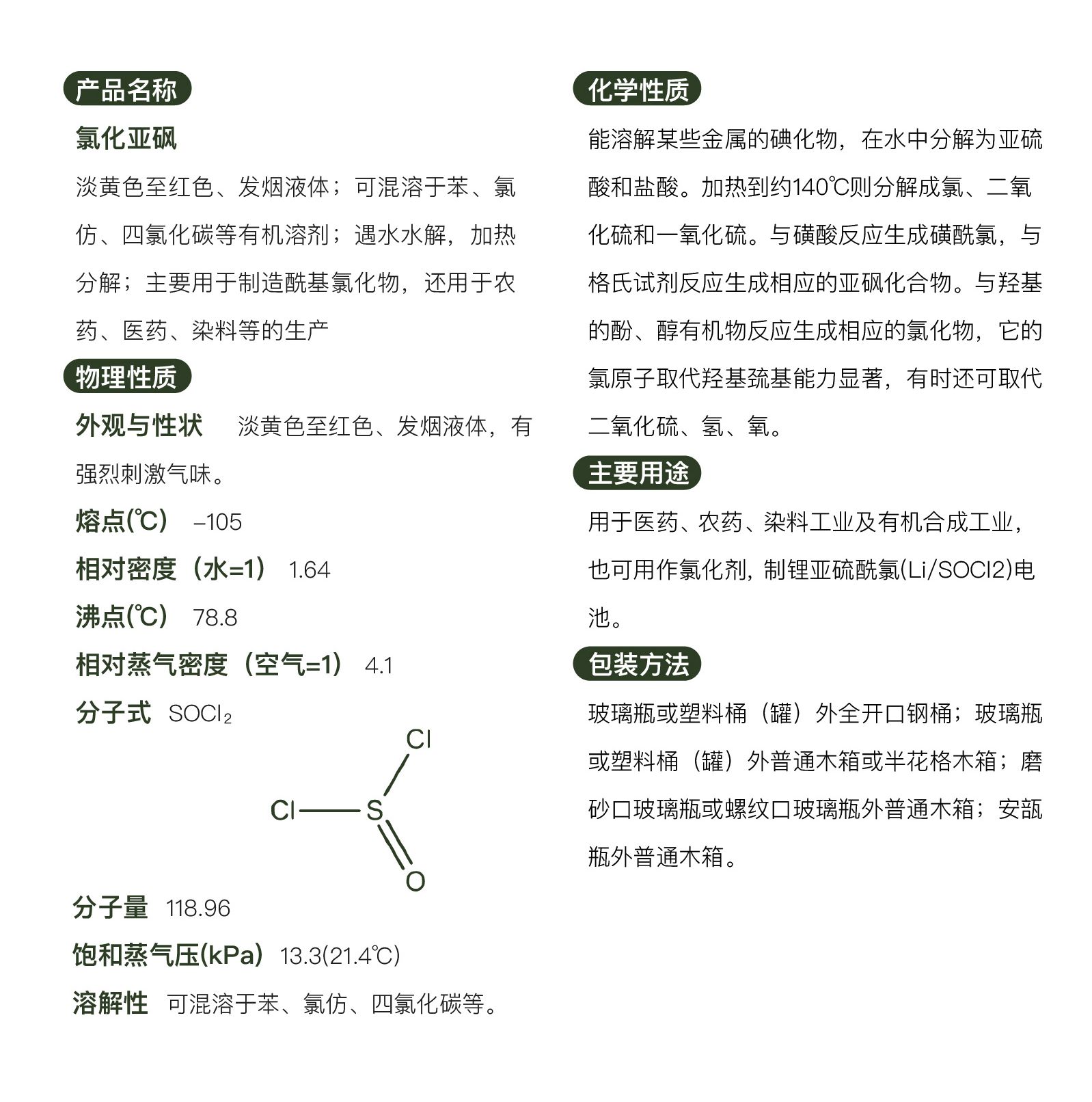 用作有机合成的氯化剂,如醇类羟基的氯化、羧酸的氯化、酸酐的氯化、有机磺酸或硝基化合物的氯置换。制造酰基氯化物。制造医药中间体,例如驱虫净、无味合霉素。还用作脱水剂和溶剂。