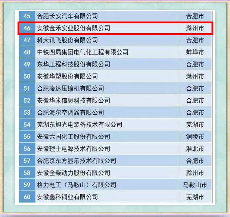 由安徽省科技厅、省高新技术企业认定管理工作领导小组办公室依据国家火炬计划统计数据,以2018年企业总收入为入围标准,公司入选“2018年安徽省百强高新技术企业”,位列第46位。