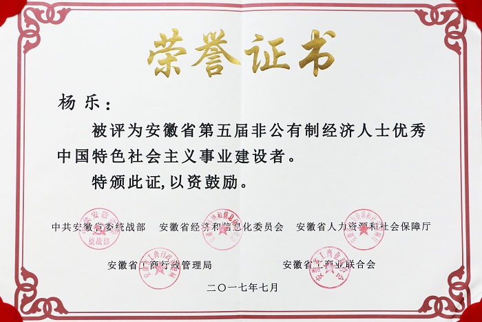 杨乐副董事长被表彰为“安徽省第五届非公有制经济人士优秀中国特色社会主义事业建设者”