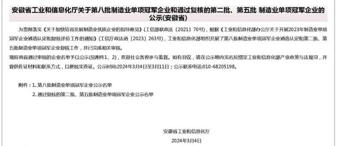 近日,安徽省工信厅公示《关于第八批制造业单项冠军企业和通过复核的第二批、第五批制造业单项冠军企业名单(安徽省)》,凭借超强的技术创新能力和领先的产品优势,我司成功入选工信部第八批“制造业单项冠军企业”公示名单,实现“零突破”,也是滁州市历史唯一。