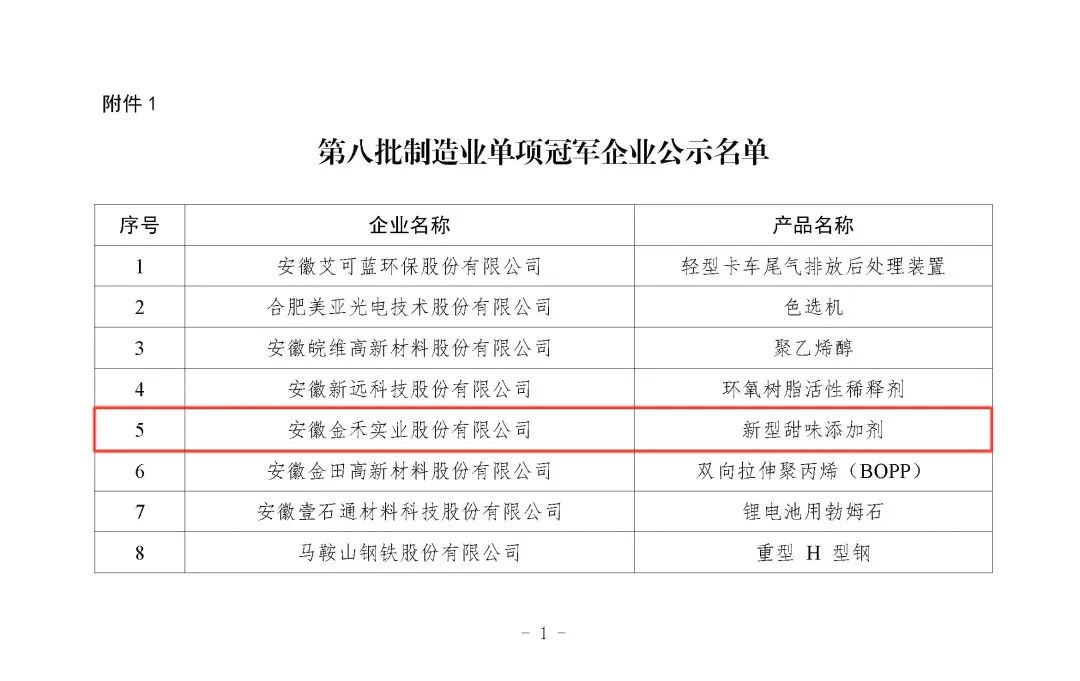 金禾实业入选工信部“第八批制造业单项冠军企业”公示名单