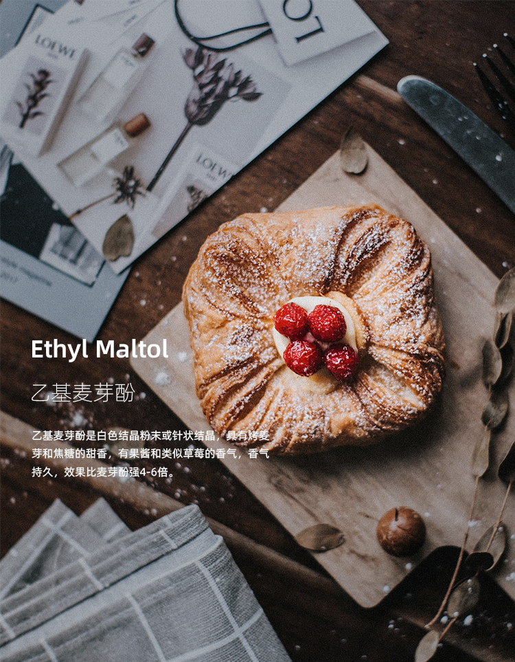 乙基麦芽酚作为增香剂,能对不同风味的食品进行增香。作为增甜剂,对食品的原有的甜味有增甜的同时,改进产品原有的苦涩味。乙基麦芽酚有风味“乳化作用”,可以使两个以上的风味更加协调,使食品产生更圆熟的风味。使整体香味更统一,产生令人满意的风味特征。