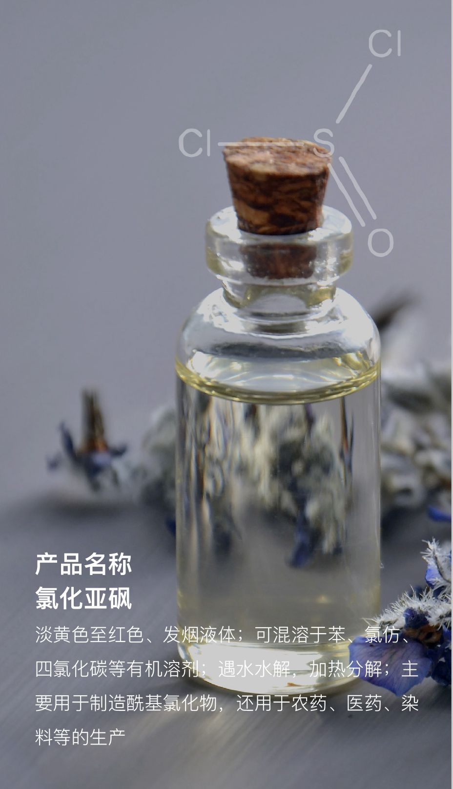 用作有机合成的氯化剂,如醇类羟基的氯化、羧酸的氯化、酸酐的氯化、有机磺酸或硝基化合物的氯置换。制造酰基氯化物。制造医药中间体,例如驱虫净、无味合霉素。还用作脱水剂和溶剂。